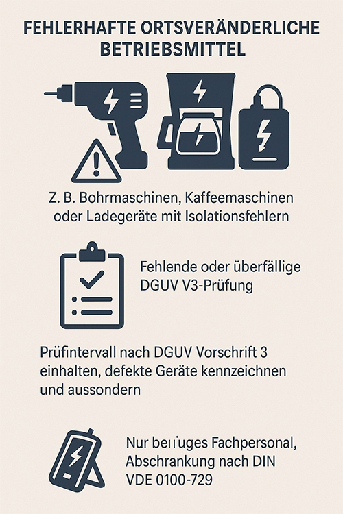 2 | Fehlerhafte ortsveränderliche Betriebsmittel | Z. B. Bohrmaschinen, Kaffeemaschinen oder Ladegeräte mit Isolationsfehlern. | Fehlende oder überfällige DGUV V3-Prüfung. | Prüfintervall nach DGUV Vorschrift 3 einhalten, defekte Geräte kennzeichnen und aussondern. |