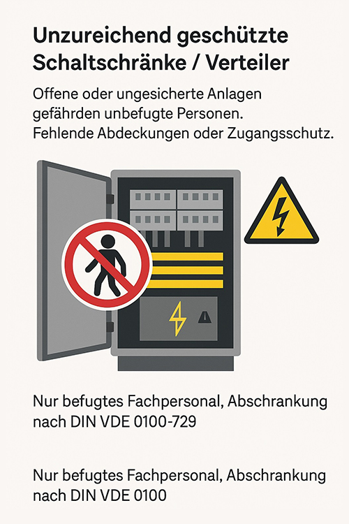 Maßnahme: Nur Elektrofachkräfte dürfen Schaltschränke öffnen oder warten. Zugänge sind abzusperren, Schränke gemäß DIN VDE 0100-729 zu kennzeichnen und zu sichern.