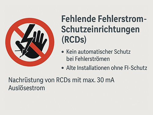 7 | Fehlende Fehlerstrom-Schutzeinrichtungen (RCDs) | Kein automatischer Schutz bei Fehlerströmen. | Alte Installationen ohne FI-Schutz. | Nachrüstung von RCDs mit max. 30 mA Auslösestrom. |