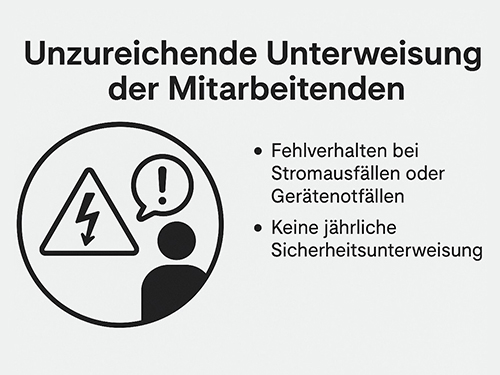 9 | Unzureichende Unterweisung der Mitarbeitenden | Fehlverhalten bei Stromausfällen oder Gerätenotfällen. | Keine jährliche Sicherheitsunterweisung. | Schulungen nach ArbSchG §12 und DGUV Vorschrift 1 durchführen. |